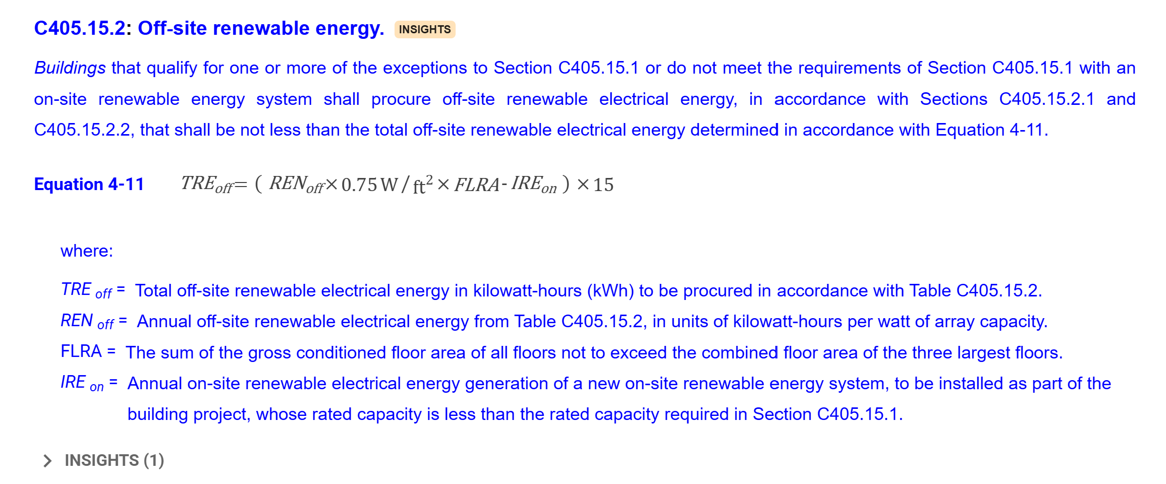 Section C405.15.1 mandatorily requires on-site renewable electricity generation systems at a minimum of 0.75W/sqft. Exceptions apply.